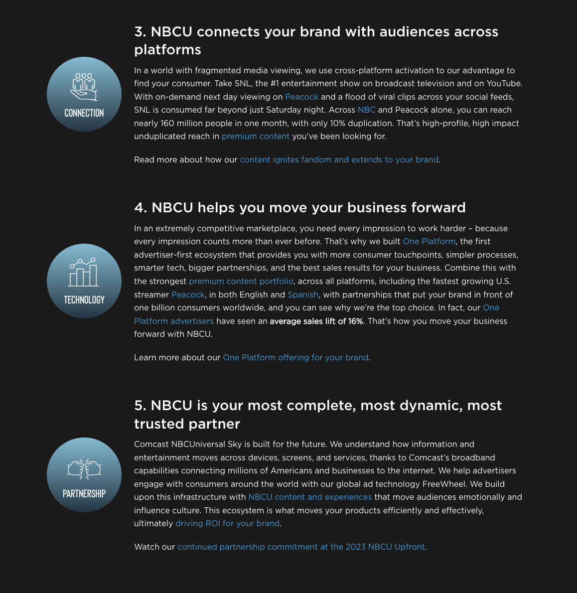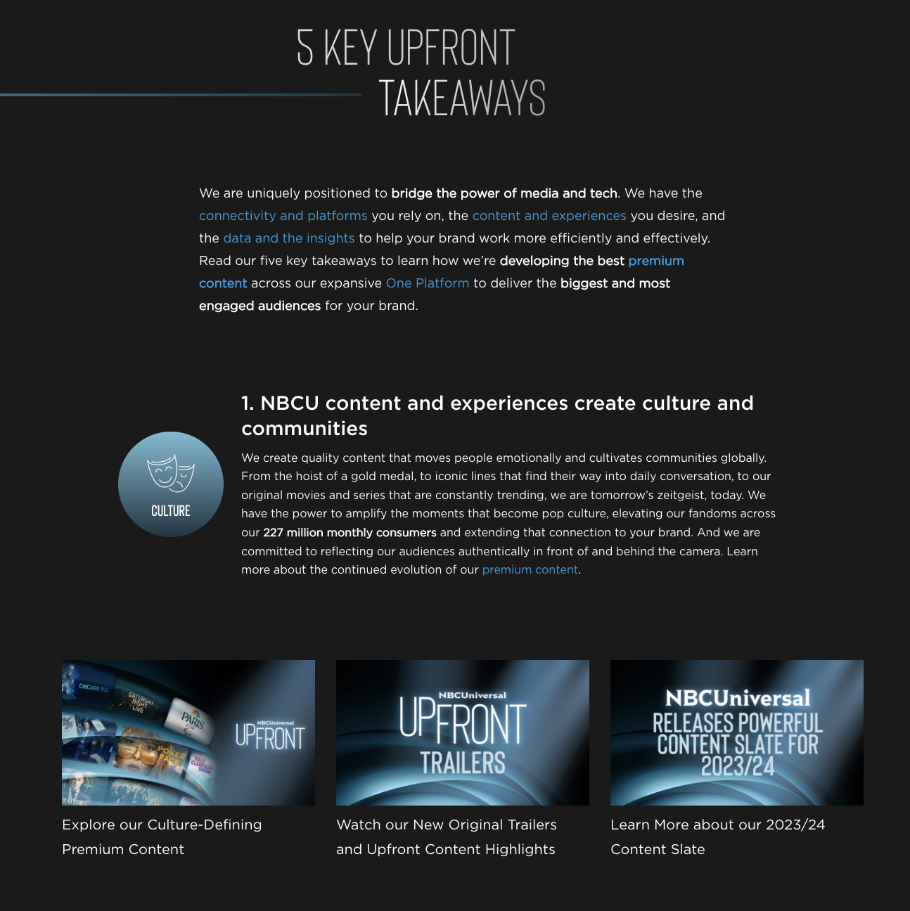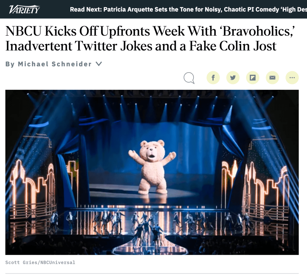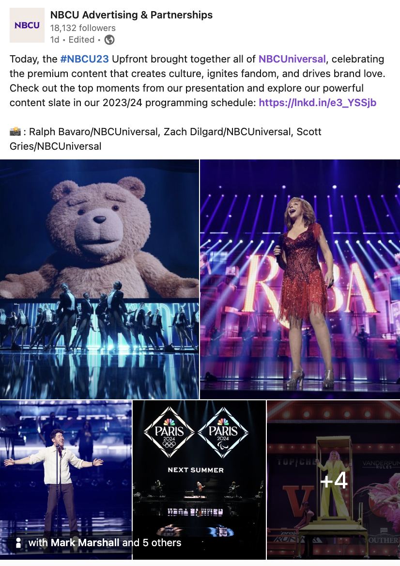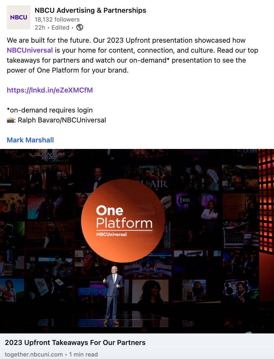 Amid a CEO dismissal, Chairman resignation, and writer’s strike, our team remained nimble and proactive to showcase NBCU’s unwavering strength and vision for the future of the company. On top of positive press and social coverage for the May 15th event, our paid social campaigns drove above average engagement and consistent traffic to the Together Site, including sales leads, during the crucial Upfront sales negotiation time period.