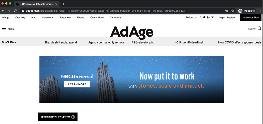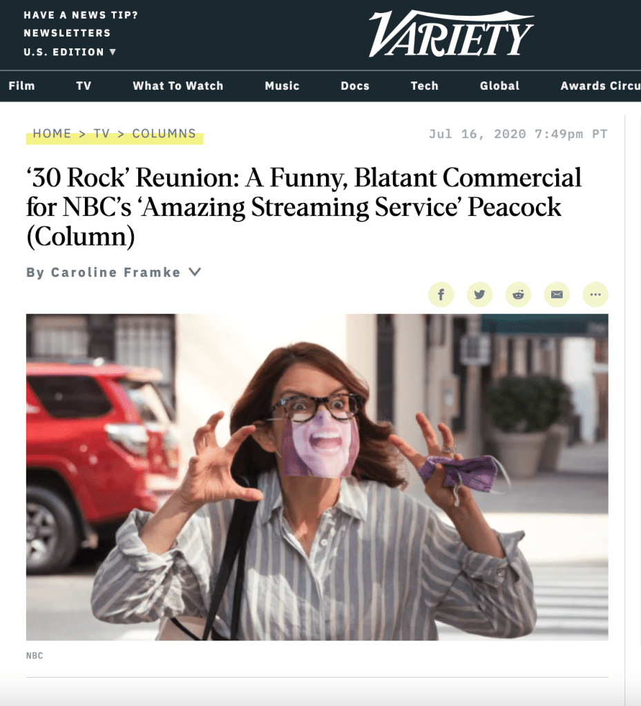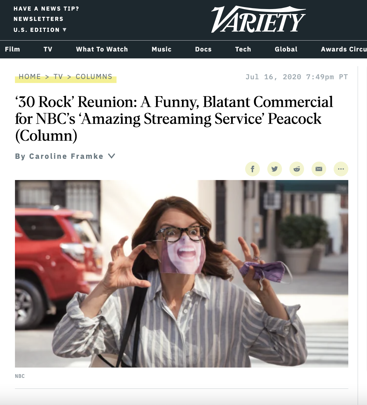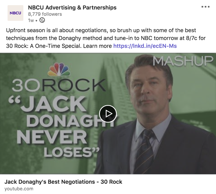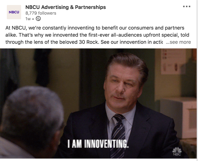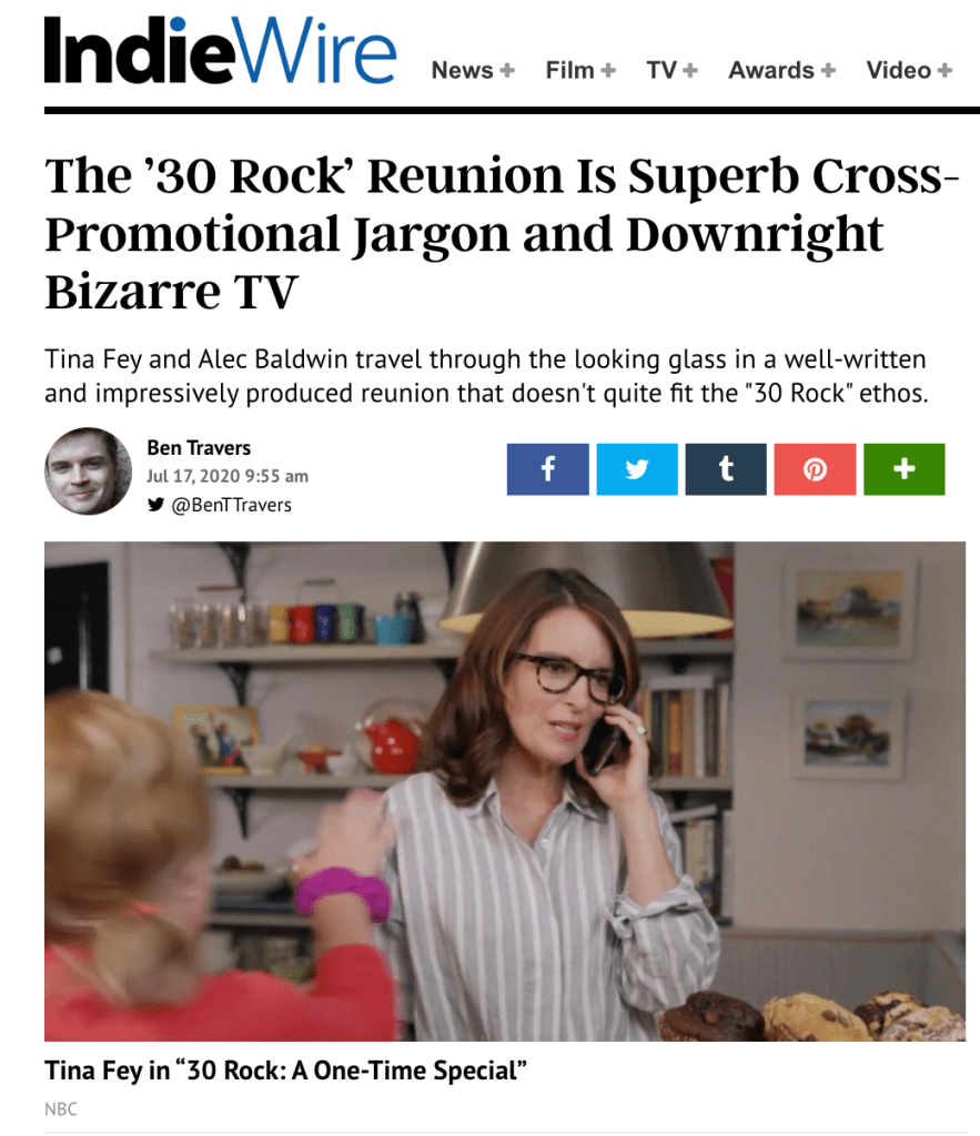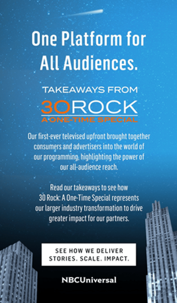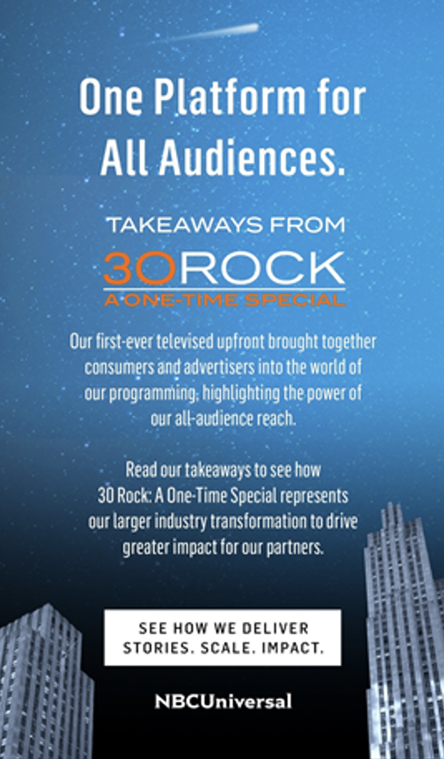 Our strategy was twofold. First, for our B2B audience, utilize existing content from past 30 Rock seasons with advertising connections to drive awareness and engagement of why we were bringing our Upfront content priorities to the big screen. This included an exclusive early viewing of the special, combined with a daylong virtual Creativity Summit featuring panels and workshops from executives and talent from across the industry. Second, for our B2C audience, we collaborated with our consumer marketing and social media teams to tap into the nostalgia and fandom of 30 Rock in a modern context. Promotional videos, imagery, and digital advertisements ran across all platforms and provided appointment television during the pandemic.