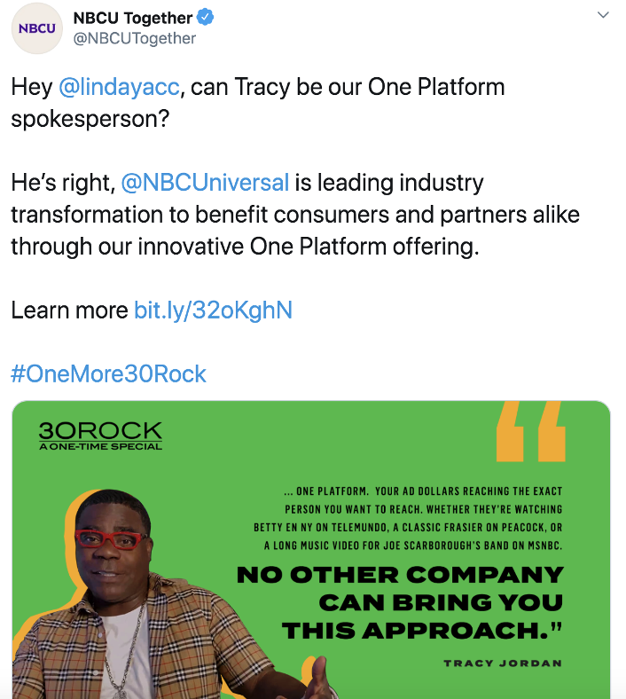 In 2020, NBCUniversal led the industry by evolving the Upfront format to fit the needs of an unprecedented situation: through a 30 Rock reunion episode. Traditionally, our Upfront presentation is reserved for industry members only, which made an hour-long television special headlined by 30 Rock favorites Tina Fey, Tracy Morgan, and Alec Baldwin, to name a few, an exciting marketing challenge.