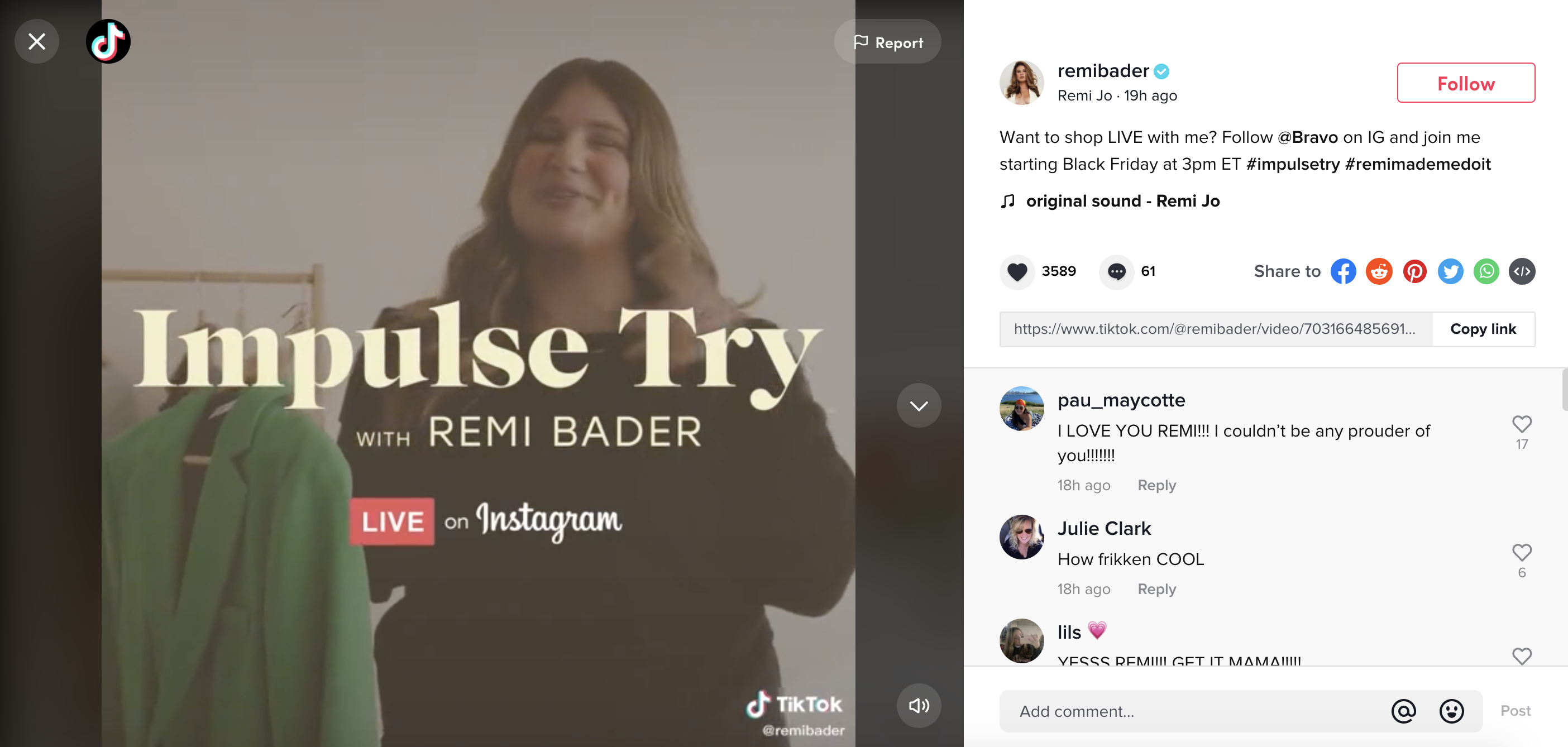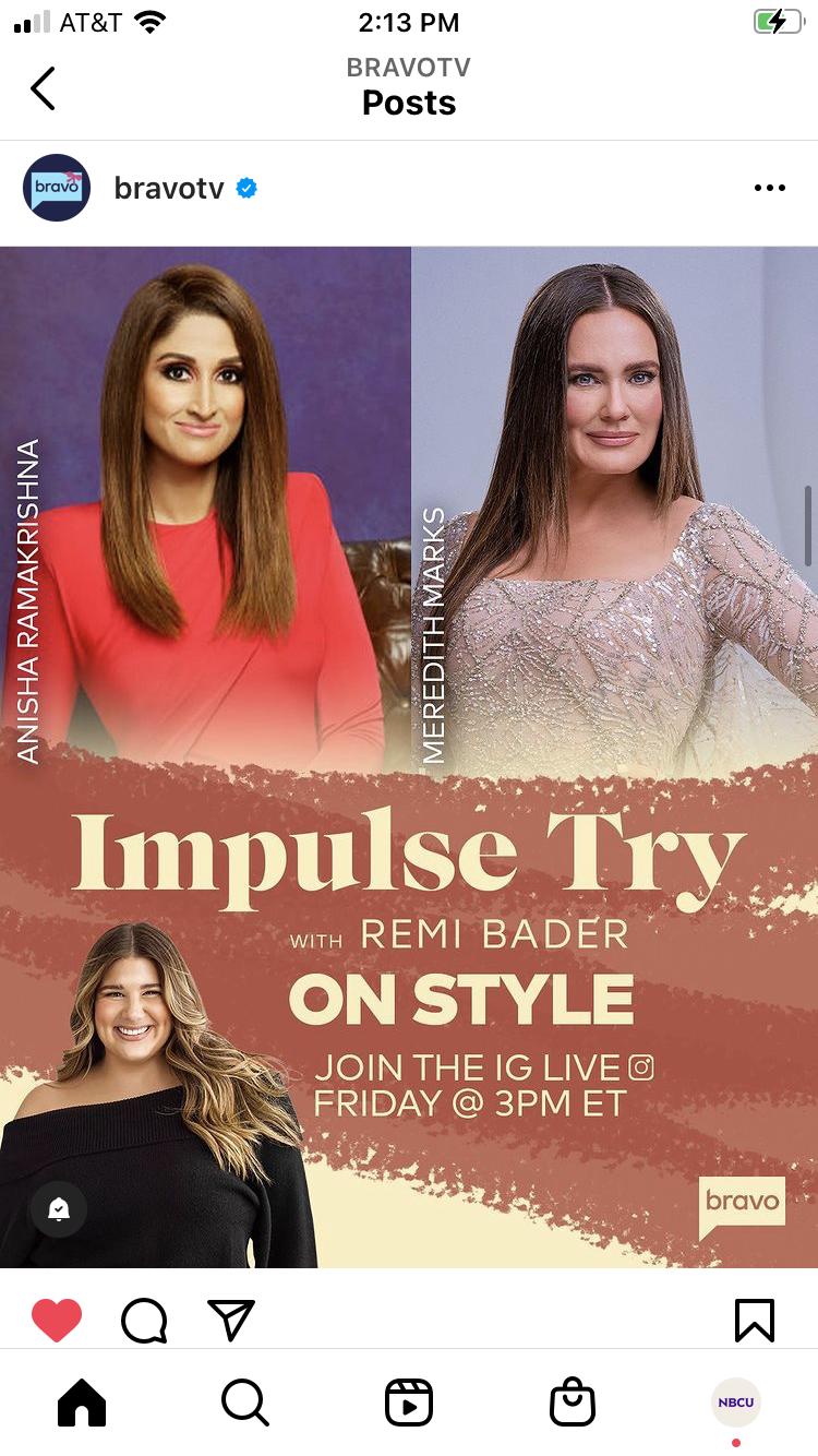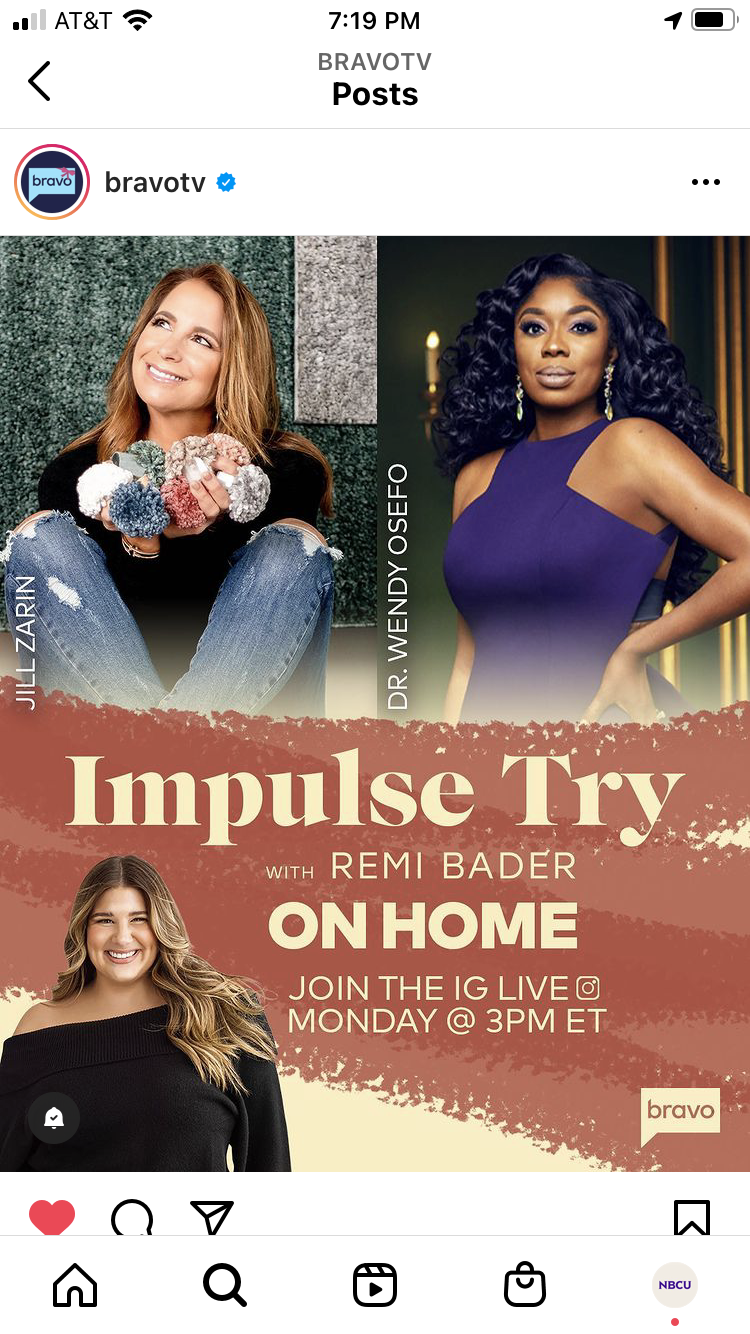 Impulse Try was a first of its kind: a major livestream shopping experience to leverage NBCUniversal’s new commerce capabilities. Within a 3 day window ahead of the event, our marketing efforts reached over 7 million and garnered tens of thousands of reactions across social platforms. Viewership was consistent across all three days, averaging a stable threshold over a thousand throughout the full 30 minute live program.