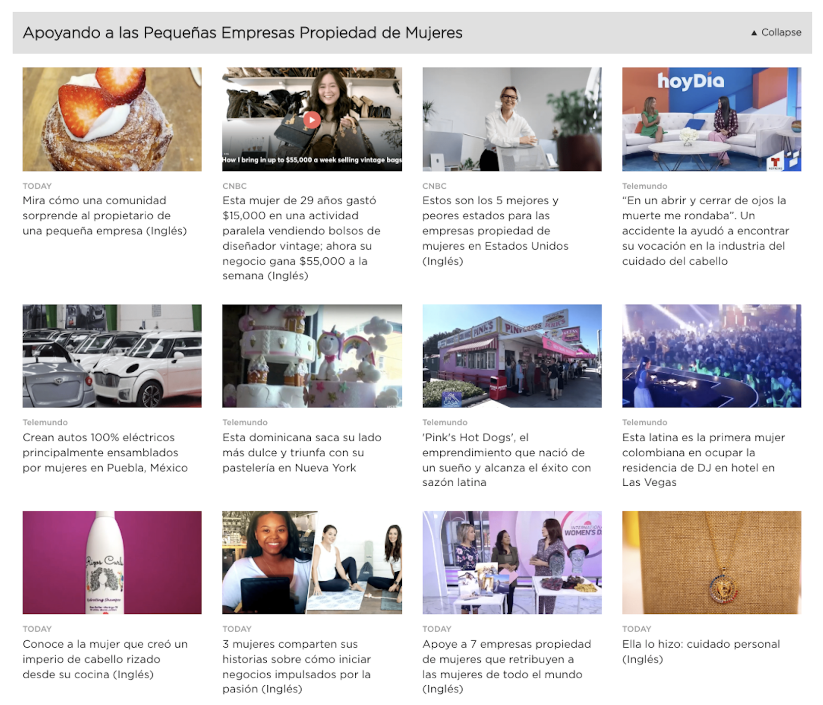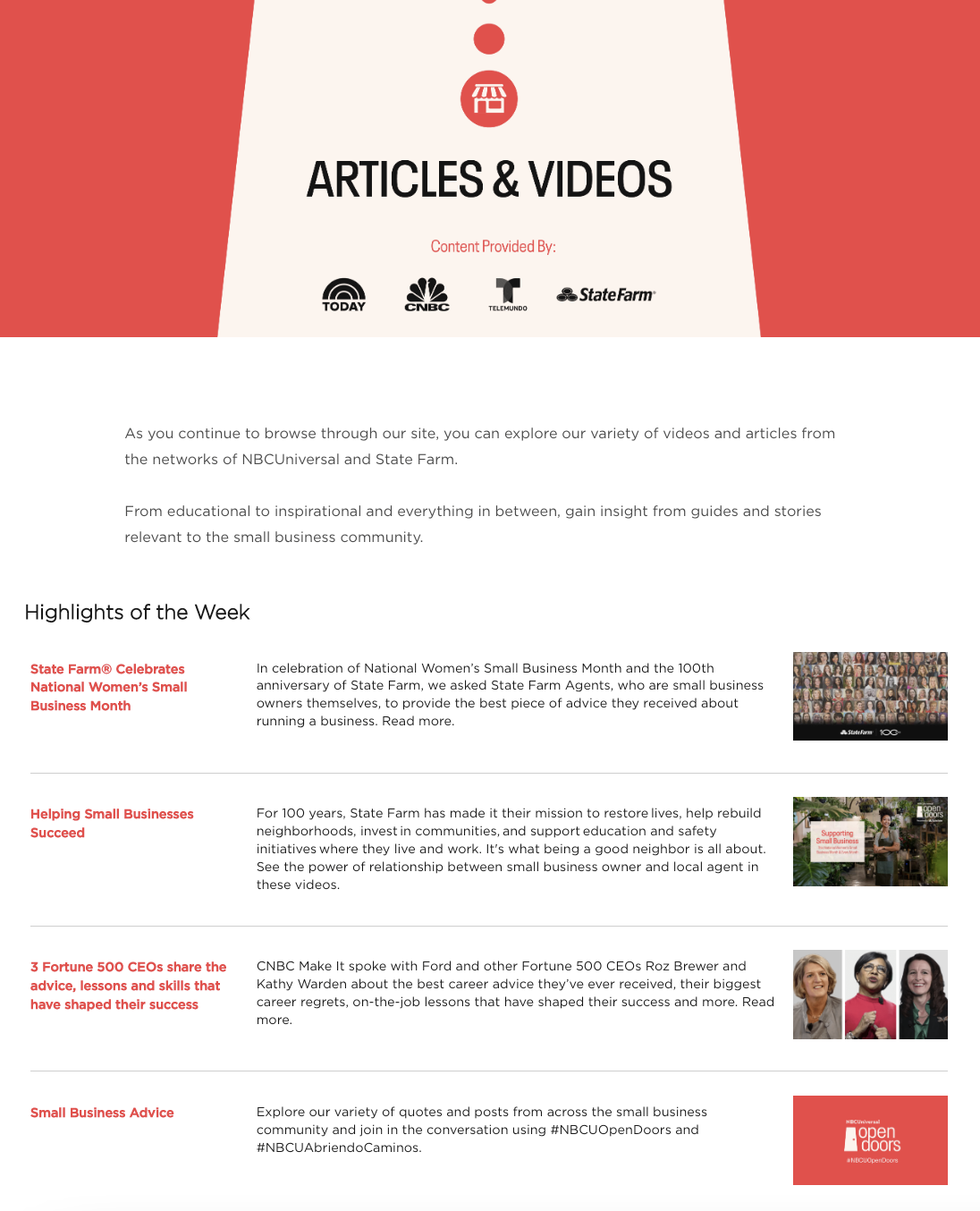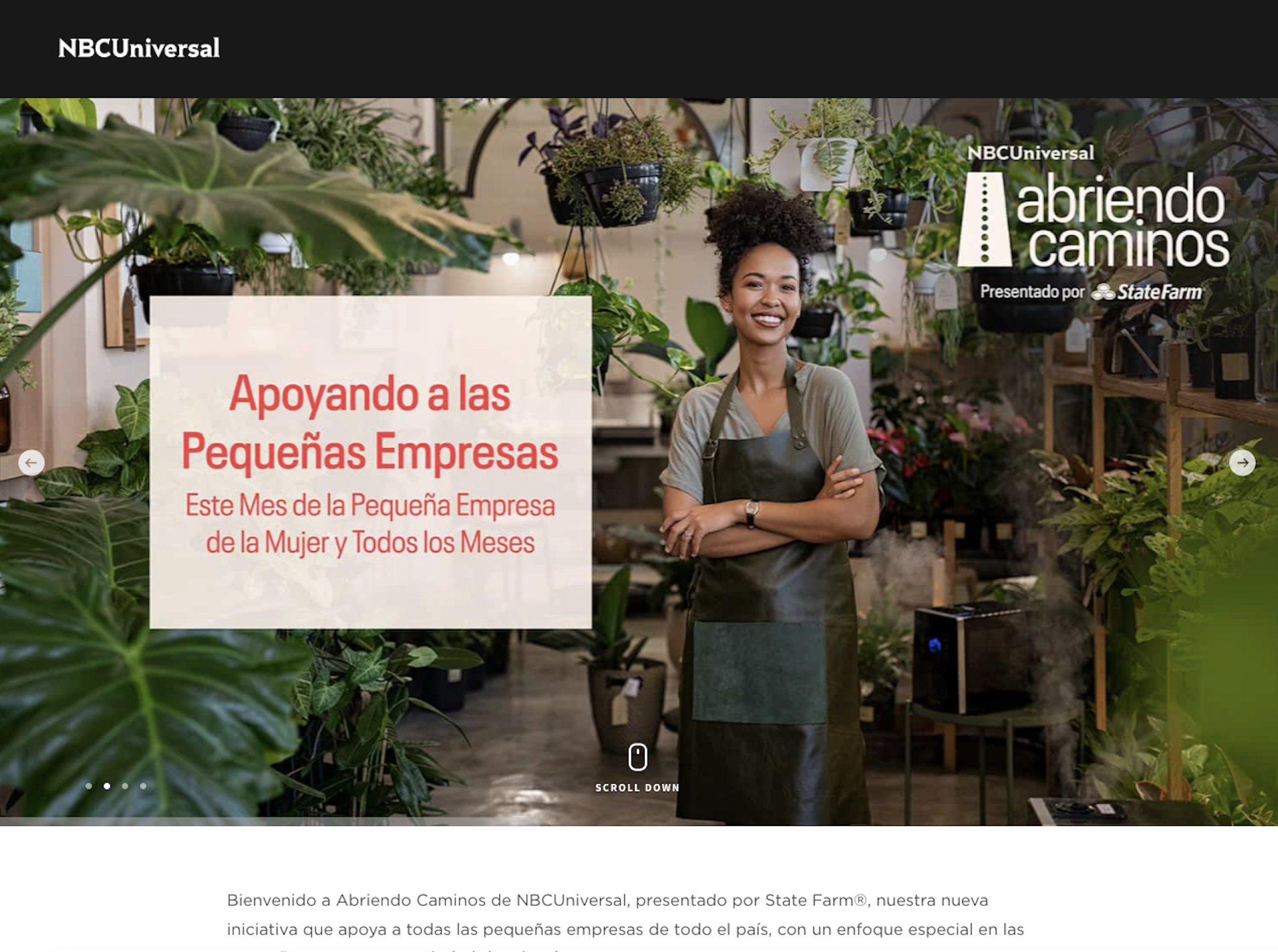To deliver on our mission of supporting small business owners everywhere, we established a high impact, always on approach that transcended platform and language. NBCU’s Open Doors (Abriendo Caminos) was positioned as a premiere destination for owners yearning for marketing expertise, but without a cost attached. Our collection of in-house produced “Marketing 101” summaries, curated network articles from TODAY, Telemundo, and CNBC, and partner resources from State Farm, all in a dual language format, kept visitors engaged with a diversity of subjects. Donated linear and digital ad time, social highlights, publication pieces, and rotating banner ads sustained traffic and kept the initiative top of mind for small business owners seeking assistance.
